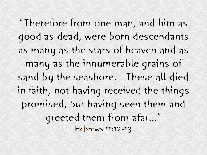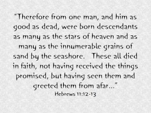 The author of Hebrews implied that what identified those who had the faith of Abraham was their faith in what God promised him in spite of what their lives were like. They trusted in the One who promised, and died in faith, looking forward to the fulfillment.