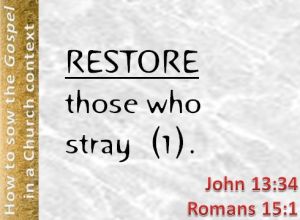 Manifesting that love means restoring those who stray away from the gospel. In Romans 15:1, Paul says “We who are strong have an obligation to bear with the failings of the weak, and not to please ourselves.”