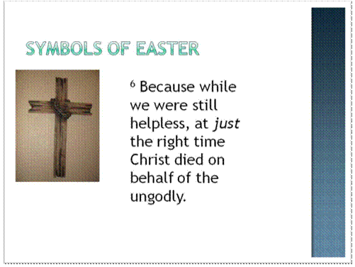 clip_image006[5]As I grew older, I came to see that behind the rituals and the festivities of Easter, there is a story that needs to be told. It is not a story that is tied to any particular season of the year, or any date on the calendar. Easter marks an event of unimaginable significance. So, as the apostle Paul shows in today’s text, Easter is a celebration of something that Christ Jesus did for us. Verse six says that while we were still helpless, Christ died on the cross for the ungodly. Only he could pay the penalty because God required a sinless sacrifice, but none of us qualified. So, God sent his only Son to die on our behalf.