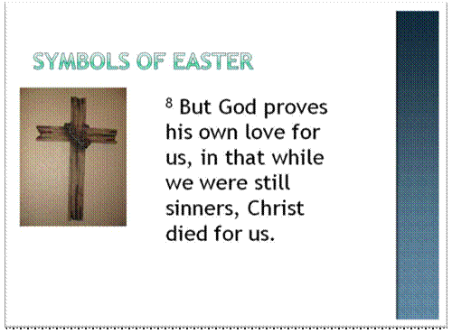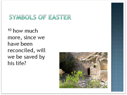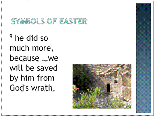 clip_image016[5]So, join me today in celebrating two symbols of Easter– the symbols of death. That sounds like a strange request, but there is wisdom in it. God took those two symbols, and he gave new meaning to them. The cross was a symbol of cruelty, torture and death. Now it is a symbol of hope and grace. The tomb was a symbol of despair and inevitable disintegration. Jesus changed the tomb’s meaning by getting up on Sunday morning and walking out of it. Now there is hope. Now there is a chance for life after death. Now there is a future beyond the grave for us. That is something worth celebrating.