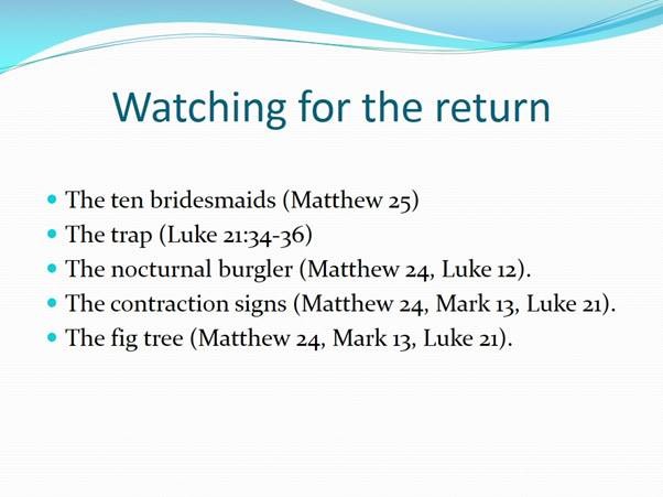 Another favourite passage for preaching about the return is the Olivet Discourse, also called the eschatological discourse, where Jesus answers three questions about his return. One of the questions that his disciples asked was how long it would be until the end of the age. Jesus told his disciples that a number of signs would occur over and over again, like contractions in a birth. His point was that those signs are not proof that his coming was soon, because the signs would keep coming over and over, like contractions during labour.