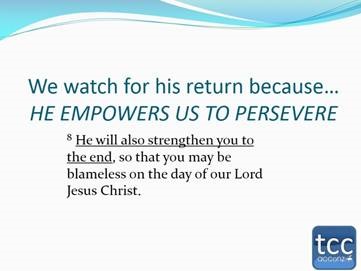Are you watching for Christ’s return every day of your life? I think we often forget about the fact that his coming is coming. It is no wonder that sometimes we feel powerless to keep going. It is that blessed hope, that expectation of the return which can motivate our perseverance like nothing else.