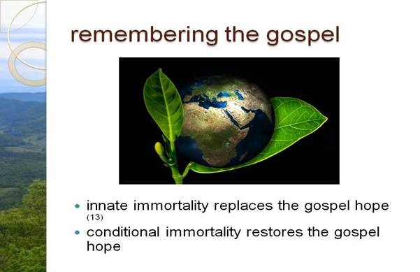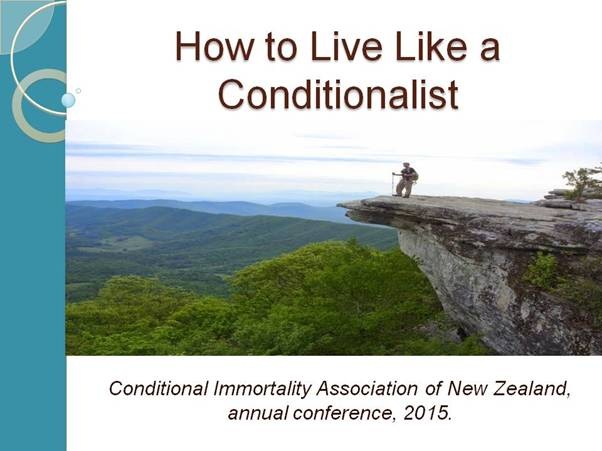 What I am suggesting is nothing short of a new Christianity based on the real gospel: the gospel of life only in Christ. I suggest we strip ourselves of the trappings of the old mythological cosmology. There is an even older story. It is the story of a promised new creation. Now, living like a conditionalist means living as if we are going to inherit that new creation. I invite you all to help me do some thinking about what that kind of life entails.