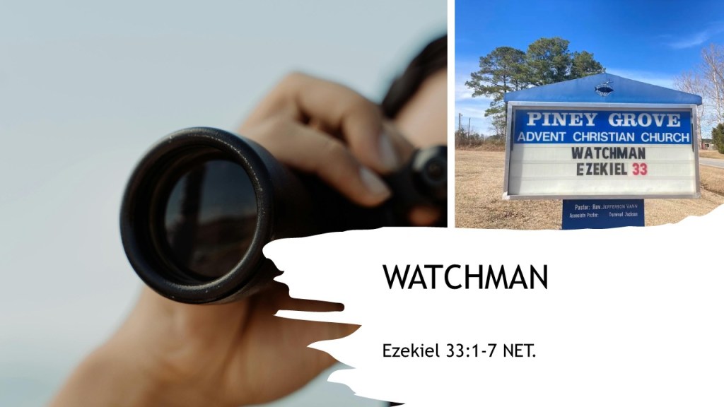 1 The word of the LORD came to me: 2 “Son of man, speak to your people, and say to them, ‘Suppose I bring a sword against the land, and the people of the land take one man from their borders and make him their watchman. 3 He sees the sword coming against the land, blows the trumpet, and warns the people, 4 but there is one who hears the sound of the trumpet yet does not heed the warning. Then the sword comes and sweeps him away. He will be responsible for his own death. 5 He heard the sound of the trumpet but did not heed the warning, so he is responsible for himself. If he had heeded the warning, he would have saved his life. 6 But suppose the watchman sees the sword coming and does not blow the trumpet to warn the people. Then the sword comes and takes one of their lives. He is swept away for his iniquity, but I will hold the watchman accountable for that person’s death.’  7 “As for you, son of man, I have made you a watchman for the house of Israel. Whenever you hear a word from my mouth, you must warn them on my behalf.